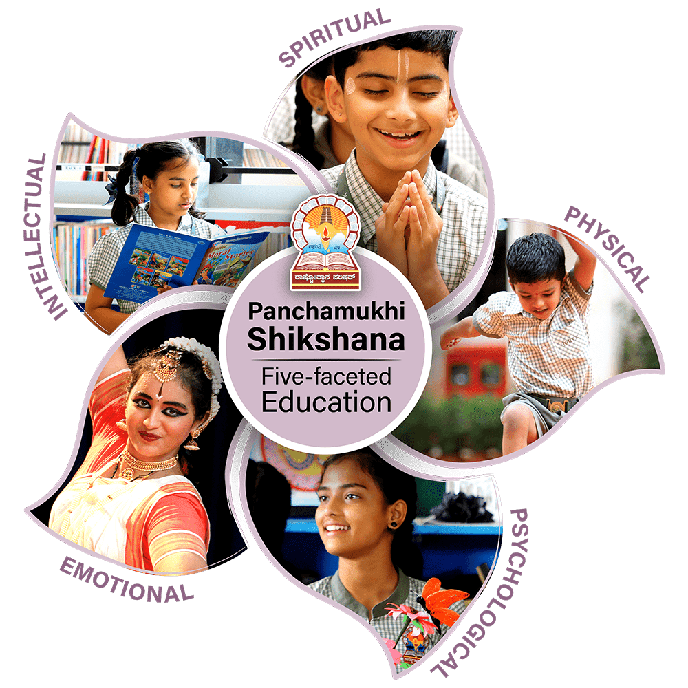 The five-fold Panchamukhi Shikshana integrates physical, psychological, emotional, intellectual, and spiritual activities into the school curriculum, aligning with the NCERT syllabus for comprehensive child development. Most schools focus on training a child to take examinations. Education for life beyond examinations and empowerment to ennoblement is often considered extracurricular. However, learning is only meaningful when it prepares a child for life. The Panchamukhi Shikshana addresses this need. At RVK, we have successfully integrated learning with the Panchamukhi qualities, linking curriculum to life skills and personal development.